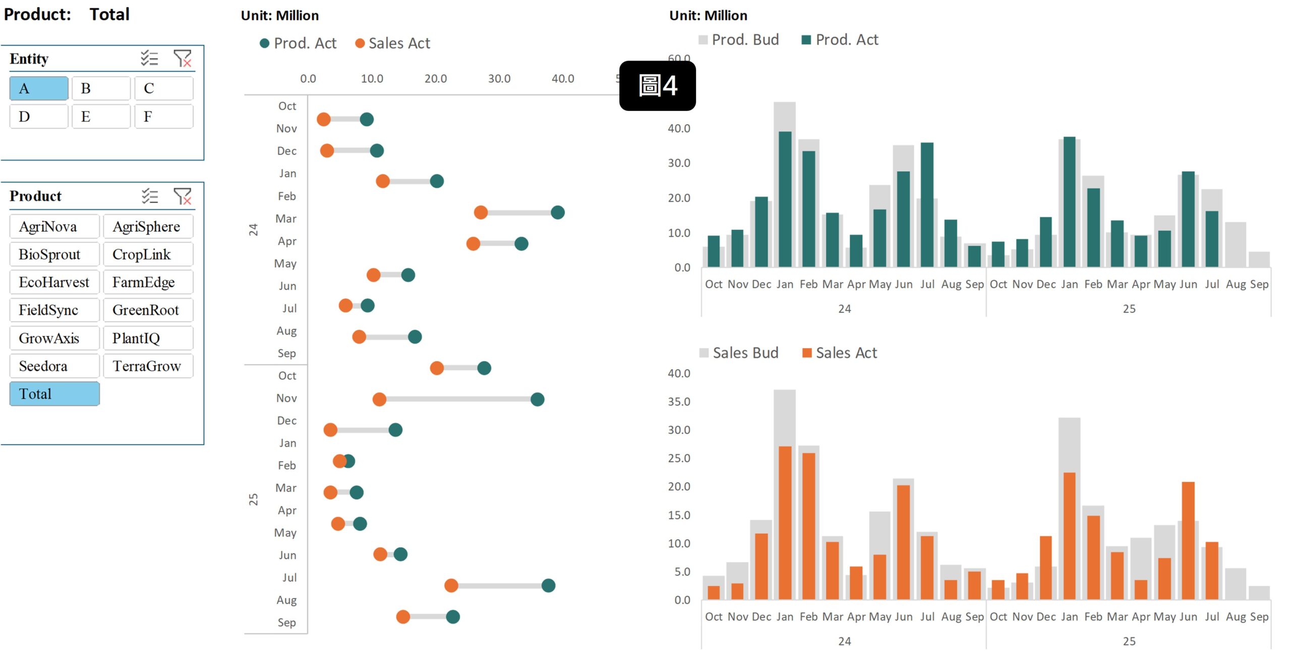 最後展示層是資料模型的門面,將分析結果以視覺化、互動化方式呈現,這部分就是要給大老闆們看爽的,讓大老闆們在最短時間掌握重點,提供按一下就懂的故事與洞察。如同圖4,讓大老闆們可以點選想要看的資料,讓差距與趨勢一目了然。
